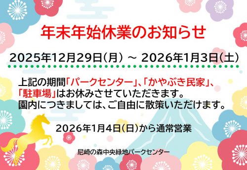下記の期間「パークセンター」、「かやぶき民家」、「駐車場」はお休みさせていただきます。