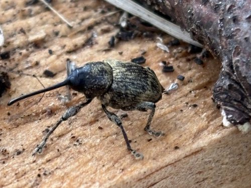 暫く観察していると、入居者とご対面!こちらのお客さんは、「ハイイロチョッキリ」。ドングリに卵を産む昆虫です。新たなお客さんに出会えて嬉しいです!