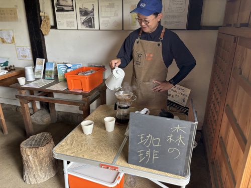 かやぶき民家に椅子を並べて、珈琲を飲みながらリラックス。森の珈琲屋さんでは、会話が弾んでいました。