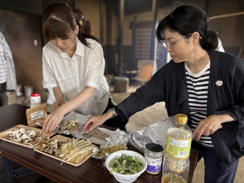 その他にも手羽先やシシャモ、チーズなどを七輪で焼いたり、燻製して調理。雨天でしたが、かやぶき民家内で、食を囲み談笑し、まるで夜のキャンプファイヤーを想像させるような雰囲気に。