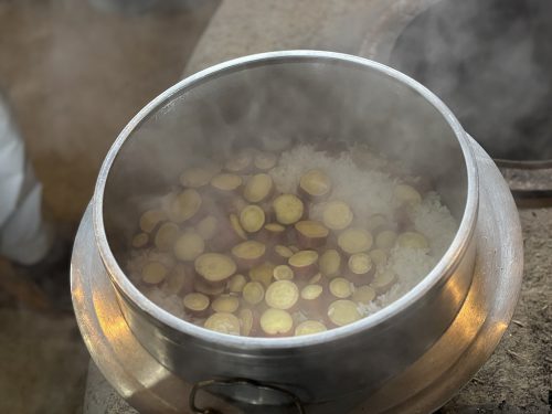 かやぶき民家のかまどでご飯を炊きました。お米はツヤが立ち、サツマイモのほのかな甘さもあり、とっても美味しかったです。