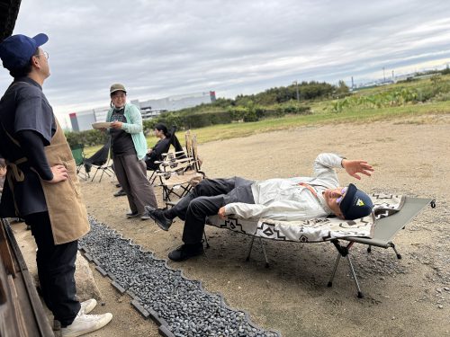 家に置いてあるアウトドアグッズを使ってみようということで、簡易ベッドを持ってこられた方がいらっしゃいました。青空の下にベッドを広げてみました。このまま寝てしまいたいですね。