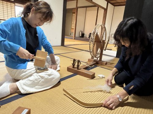 尼崎の森中央緑地の畑で栽培された木綿で糸を紡ぎました。糸にするまでに、綿から種を取り除く「綿繰り」や、その綿をほぐす「綿打ち」などに挑戦。同じ動作を繰り返すことで、意識が没頭し、心身が整いました。