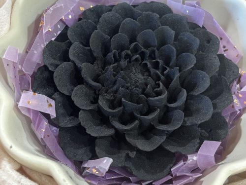 上の写真も「使いたくなくなるかも~」な一品。マツボックリの炭のように花を炭にしたのかな?と思いきや、なんと2月に炭団づくりを教えてくださる方が、手作りされた炭団アートです!!こんな細かい花びらどうやって作ってるのー!?と訊いてみたら、さすがに企業秘密でした。炭なので、消臭効果もあるのだとか。宝塚の某ホテルなどで飾られているそうですよ。こんな素敵な炭団アート、火をつけて使うなんて、もったいなくてできません~~。
