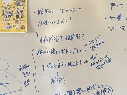 そんなこんなで企画内容がかたまってきたところで、「炭団づくりが、どう防災につながっているかが大事やと思います。」と、先月、防災士の資格を取られた参加者からの一声が。そうですよね!ということで、炭団づくりをされている参加者の方から、炭団の特性を伺い、どう防災につながるかをみんなで話合いました。