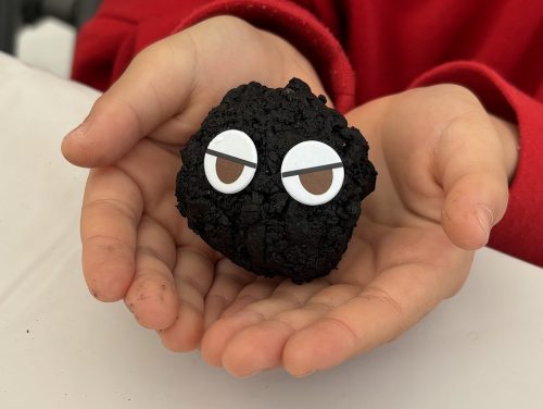 丸めた炭団に目を付けると完成!「たどん君」と呼んでいる親子の姿も見られ、炭団に親しんでもらうことができました。