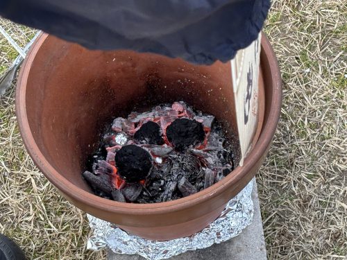 コンクリートブロックは、空気を入れる空間が少ないので、炭団に火を点けるのが難しかったのですが、試行錯誤を繰り返し、お湯を温めることができました!