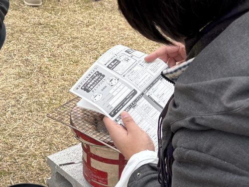 ブースで体験してもらった方に、防災グッズチェックリストの用紙を配りました。今回、ブースで炭団づくりに挑戦した人たちは、グッズに炭団が入りますね。この調子で、他の備蓄品も備えていきましょう。
