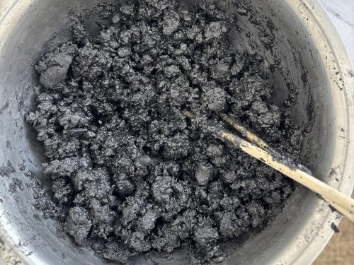 こなごなの炭に小麦粉や片栗粉、水を混ぜるとドロドロに。これを手でこねて丸くしていきます。